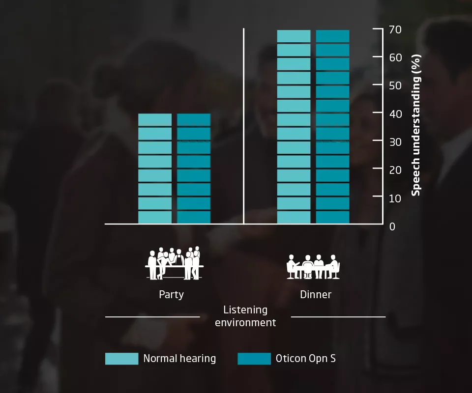 研究证明,在嘈杂的环境中,奥迪康Opn S能帮助用户的言语识别力无限接近正常听力。